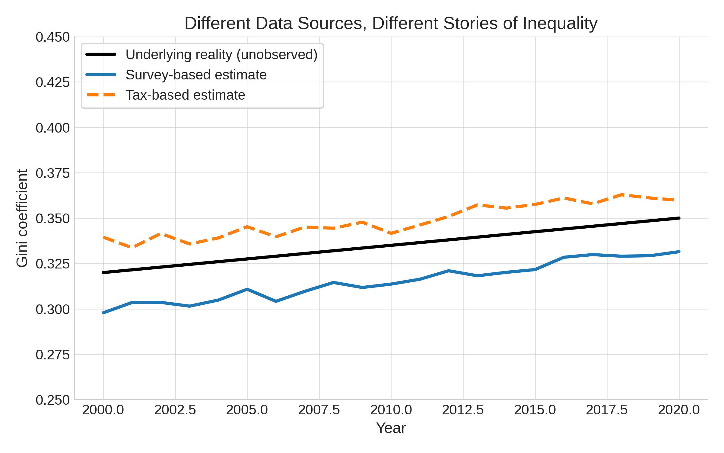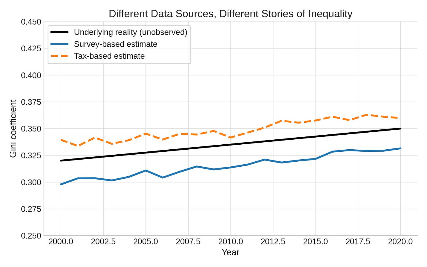 In short: garbage in, garbage out. Below, with simulated data I show that inequality looks very different depending on the data source. Household surveys (blue) understate top incomes and show a flatter trend. Tax data (orange dashed) captures the top better and suggests inequality is rising faster. The underlying “true” inequality (black) is never directly observed. The choice of dataset alone can change the story.