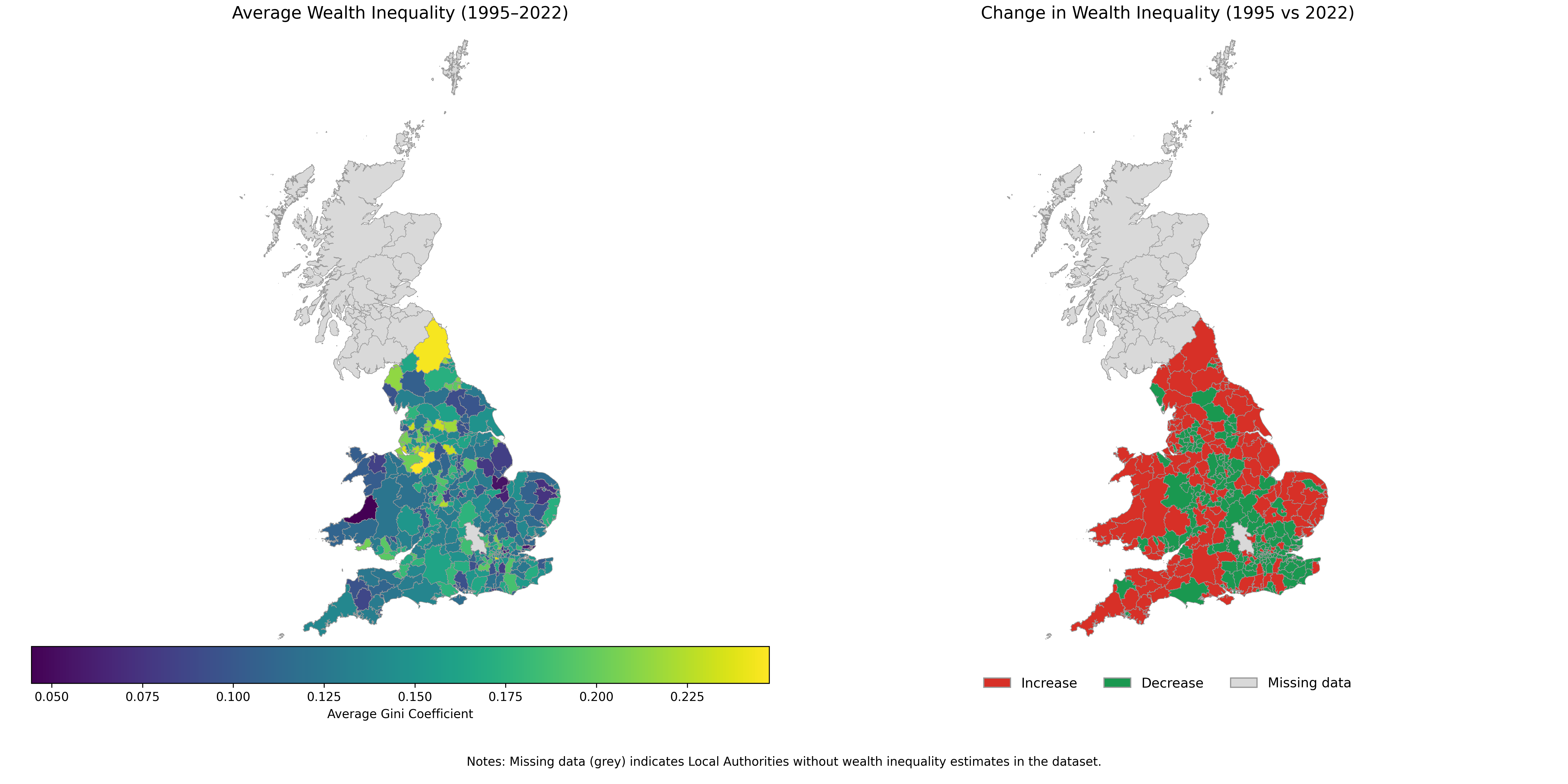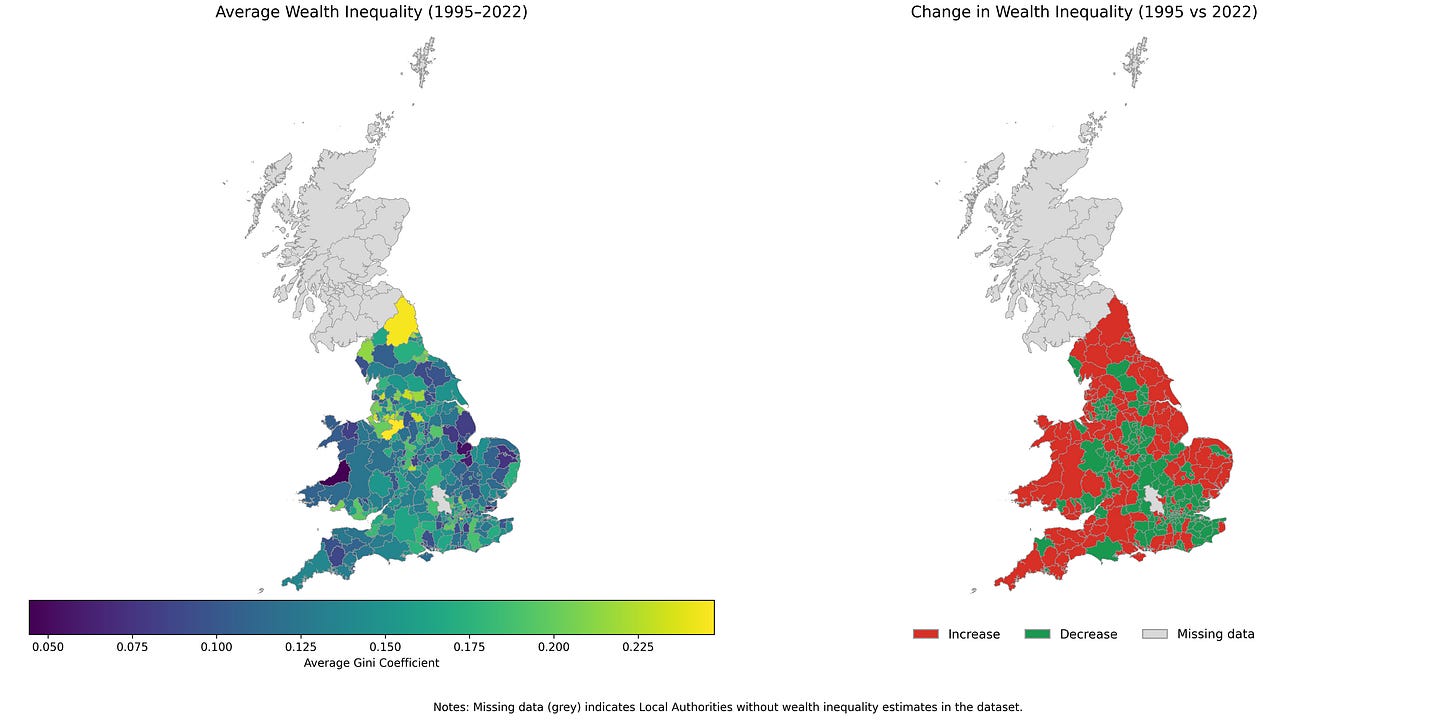 When mapped geographically, local wealth inequality reveals striking variation across England and Wales. Some local authorities show persistent high inequality, others much lower. But when you look at change over time, much of the South lights up red: wealth inequality has increased in most areas since the mid-1990s.