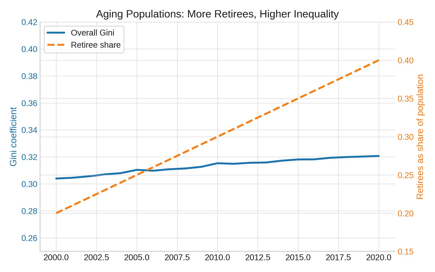 Let’s take the aging populations: more retirees means higher inequality: suppose workers earn around £40k and retirees around £20k. Within each group, incomes stay constant over time. But as the population ages and the share of retirees doubles, the overall Gini coefficient rises - purely because of demographics. Below a simulation with dummy data:
