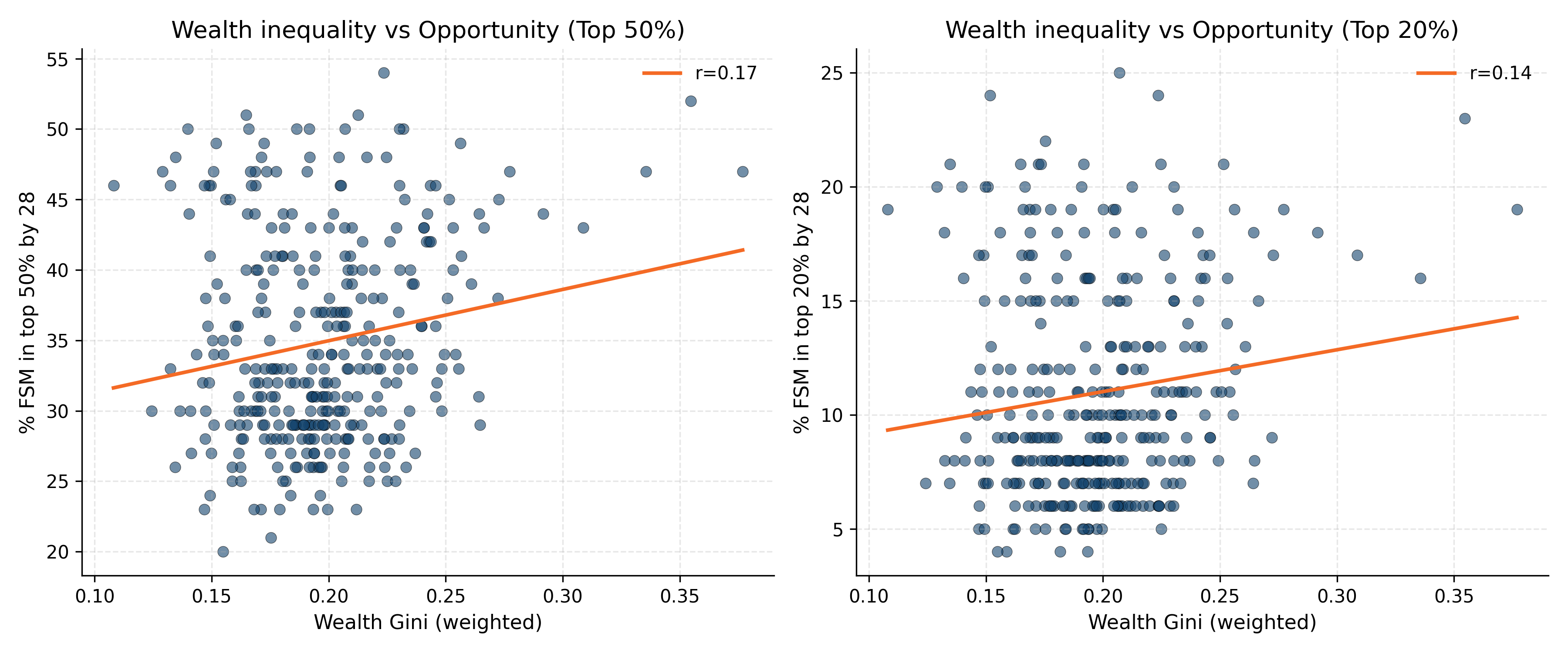 Finally, I compared wealth inequality (house price Ginis) to measures of social mobility from the Opportunity Index of Sutton Trust. Why make this comparison? Because inequality matters most when it affects opportunity. Classic economic theory (shoutout to the Great Gatsby Curve!) may tell us that high inequality can translate into barriers to mobility - fewer rungs on the ladder, or rungs spaced further apart. Wealth inequality is particularly relevant here: housing markets shape where families live, what schools children attend, and what networks they can access. If house prices are highly unequal within an area, poorer households may be priced out of high-opportunity neighborhoods, reinforcing disadvantage. (The counterargument may be though that high inequality can offer strong incentives to mobility but let’s just ignore for now…).