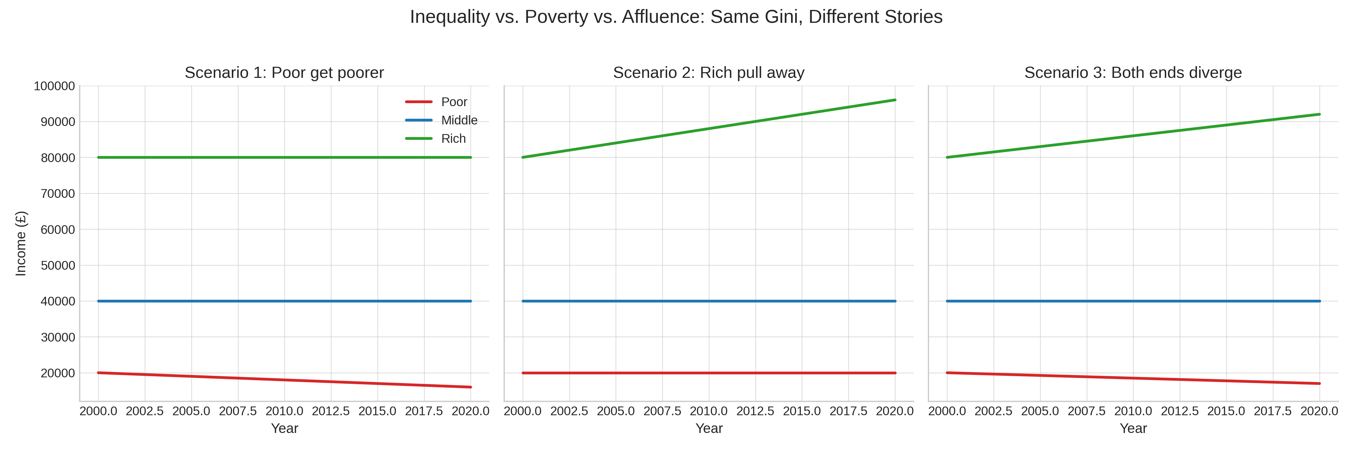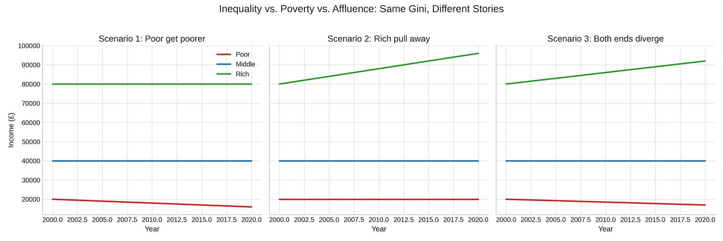 Even if we set on one measure, a change in the measure can mean different things. For instance, a rising Gini can mean: the poor got poorer or the rich pulled away. Or both. But most measures don’t distinguish. That makes them blunt instruments for understanding social change. Below three scenarios that mean that provide similar Gini coefficients with different underlying stories: