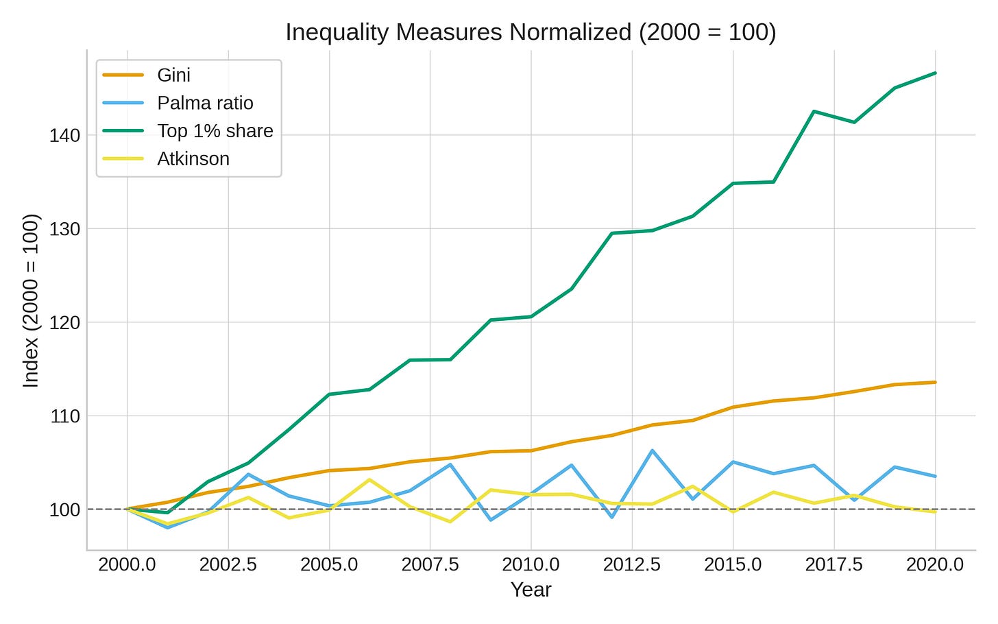 Then, assuming we have data, we need to use it wisely. Economists love indexes - Gini, Theil, Palma, Atkinson - but they don’t agree. One measure says stable, another says inequality is soaring. See below a little simulation: normalising inequality measures shows how differently they evolve - the Gini is steady, Palma and Atkinson barely move, while the top 1% share surges, underscoring how the story depends on which metric you choose (a fact that politicians know very well…).
