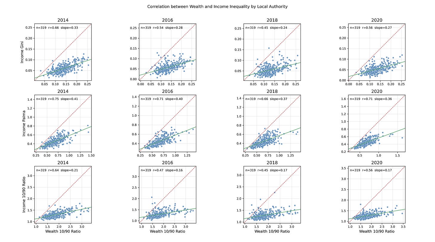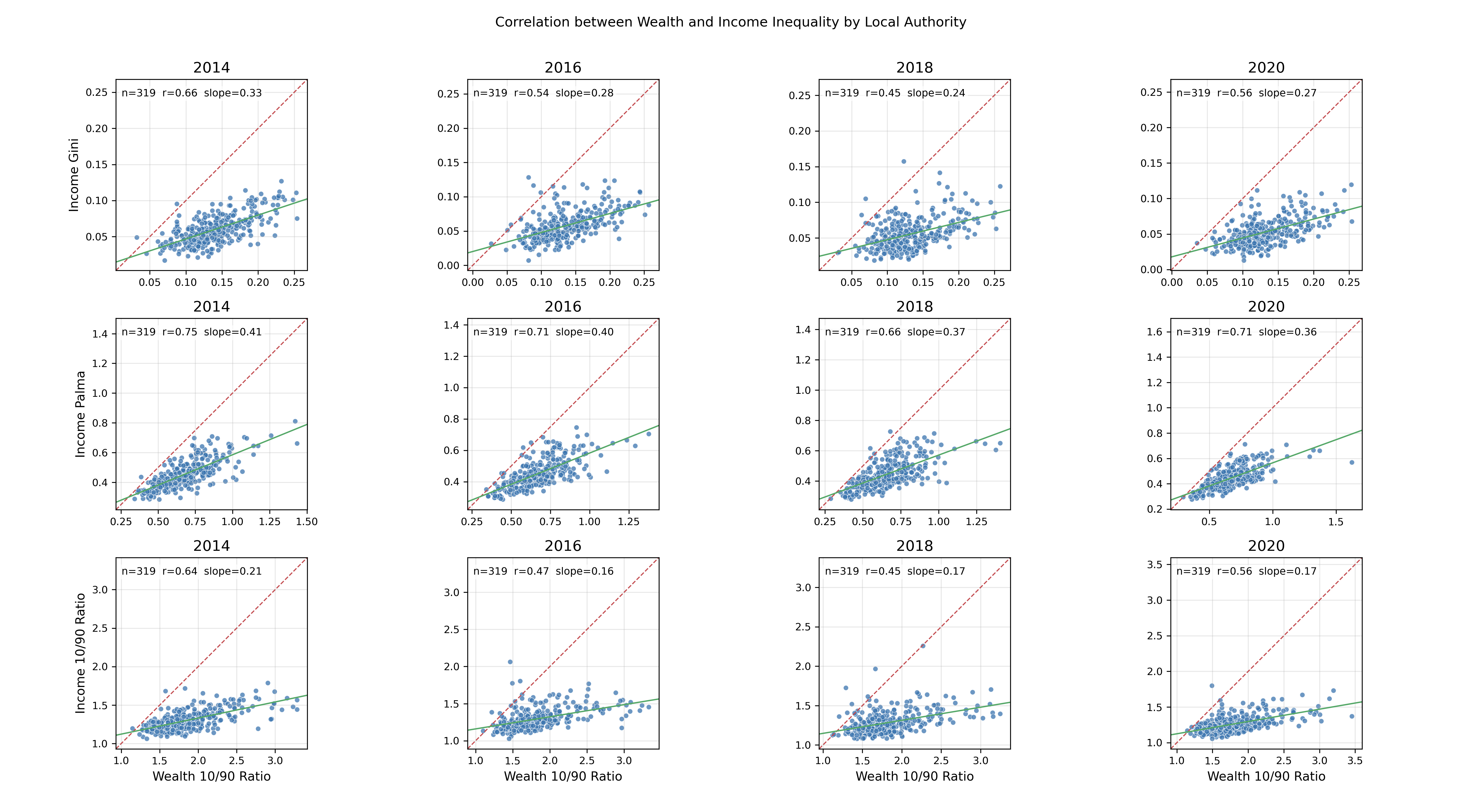 How do these measures compare over time? Across 2014-2020, local wealth and income inequality are positively correlated, but wealth measures consistently run higher and diverge more strongly over time, showing that where you live often looks more unequal in assets than in income.